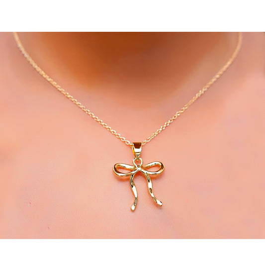 Anti-tarnish bow pendant necklace. Designed with a cute and minimal bow-shaped pendant, this necklace brings a soft, feminine look that pairs effortlessly with both casual and dressy outfits. The premium gold-tone finish gives it a bright, polished shine that stays beautiful for a long time. ⭐ Key Features: Cute and...