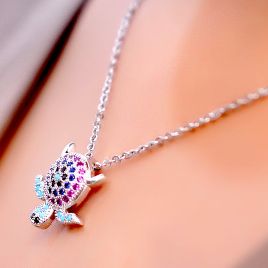 Turtle Pendant Necklace, beautifully crafted with multi-colored crystals. The vibrant stones add a stunning pop of color, while the sleek silver-tone chain gives it a modern and elegant finish. Symbolizing good luck, protection, and long life, this turtle pendant is not only a stylish accessory but also a meaningful one....
