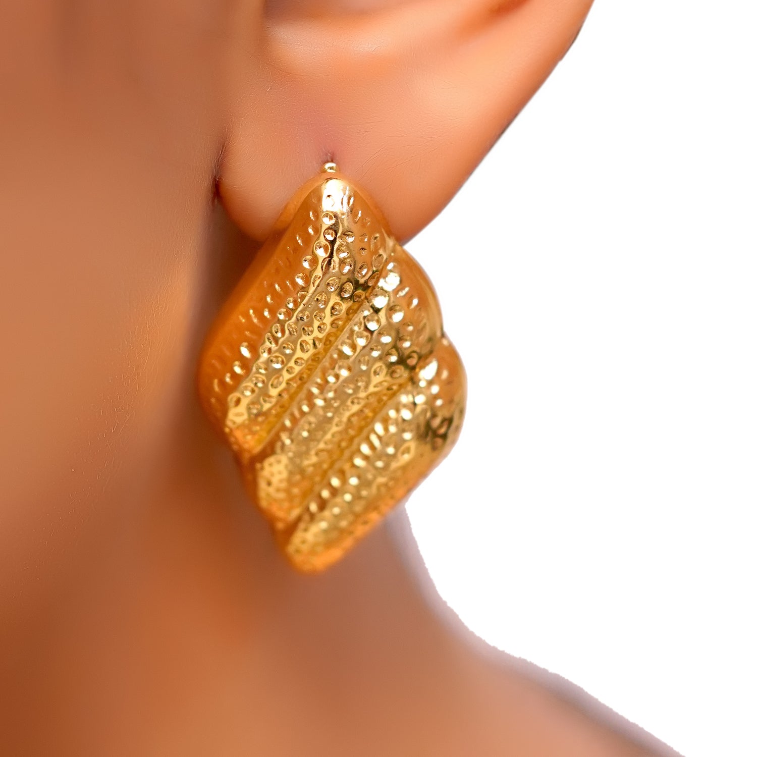 Anti-tarnish textured gold stud earrings. Designed with a unique layered pattern and a beautiful hammered texture, these earrings offer a rich and luxurious look that instantly elevates any outfit. Their premium gold-tone finish ensures a classy glow, making them perfect for festive styling, parties, and everyday chic fashion.