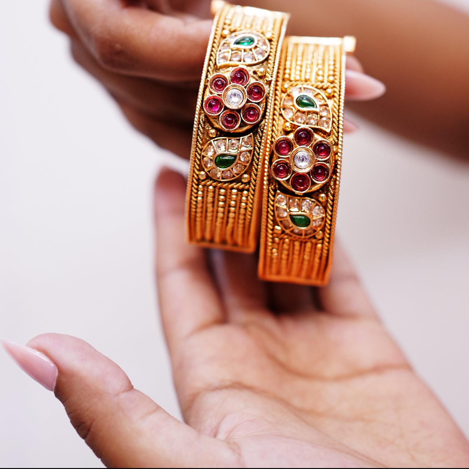 Embellished with red, green, and white stones in floral and paisley motifs